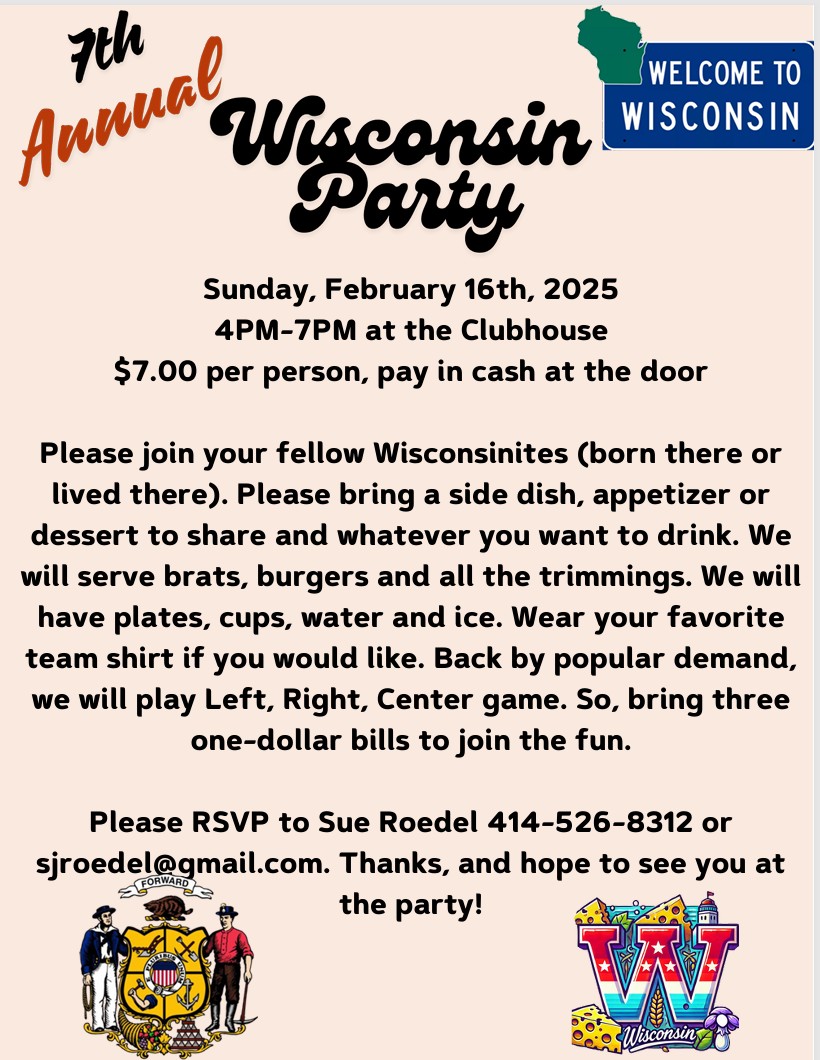 7th Annual Wisconsin Party Sunday, February 16th, 2025 4PM-7PM at the Clubhouse $7.00 per person, pay in cash at…
